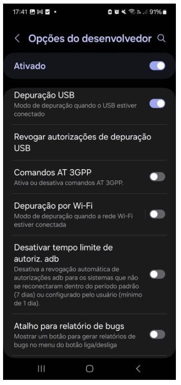 - Enable "Opções do desenvolvedor" (Developer options). Enable "Depuração USB" (USB Debugging)